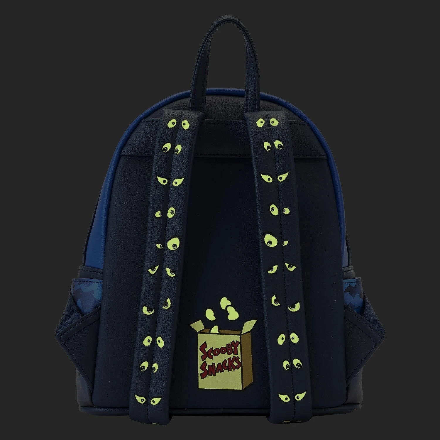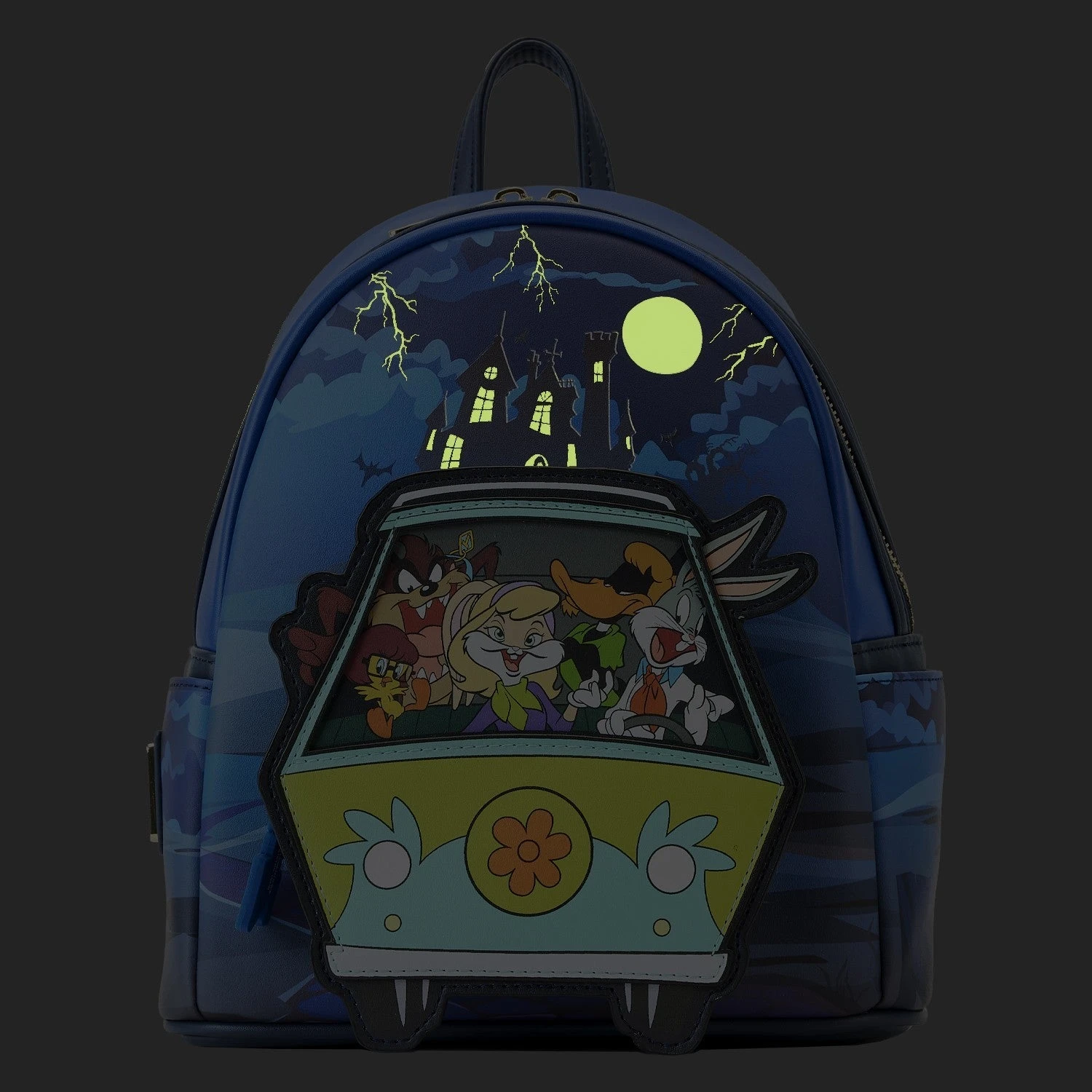 The Loungefly Warner Brothers 100th Anniversary Looney Tunes Scooby Mashup Mini Backpack is made of vegan leather (polyurethane). Bag has adjustable shoulder straps and sturdy metal hardware. Additional features include applique, glow-in-the-dark, and printed details. Take note of the coordinating inside lining.