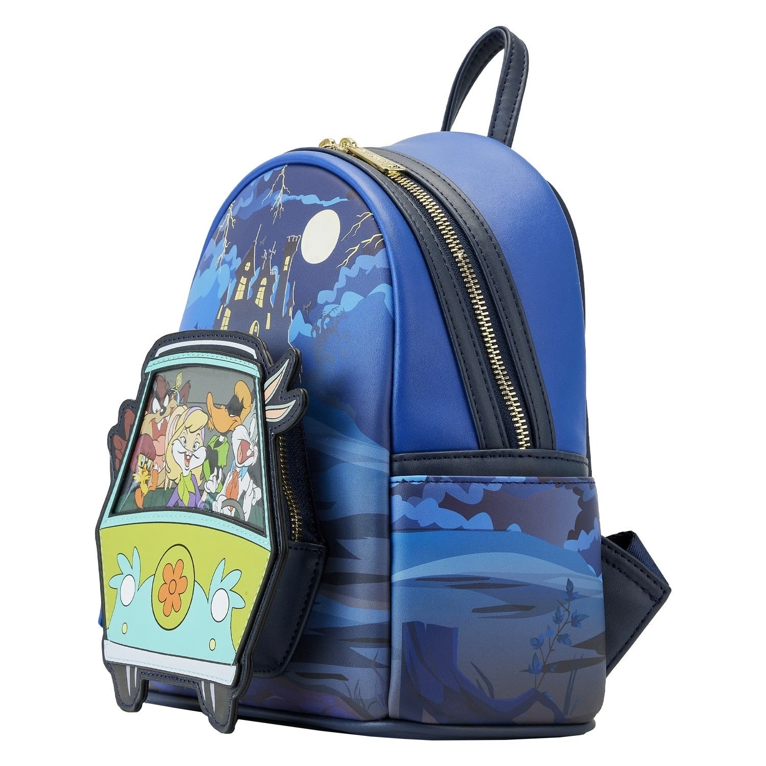 Ruh-roh! These meddling kids are creating spooky hijinks on the Loungefly Warner Brothers 100th Anniversary Looney Tunes™ Scooby Mashup Mini Backpack. Hop in the Mystery Machine™ on the front zipper pocket, where Bugs Bunny™, Daffy Duck™, Lola Bunny™, the Tasmanian Devil™, and Tweety Bird™ appear as members of the Scooby-Doo™ gang. A silicone zipper charm of Shaggy’s famous catchphrase appears nearby, and glow-in-the-dark details highlight a menacing manor in the distance. Get a taste of Scooby-Doo’s favorite treat on the bag’s back, and turn down the lights to be haunted by mysterious eyes on the straps! Guaranteed to solve the case for a groovy outfit, this one-of-a-kind accessory is perfect for tracking down clues on your hare-brained schemes.