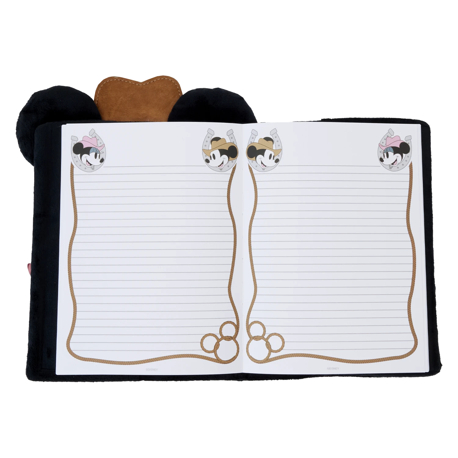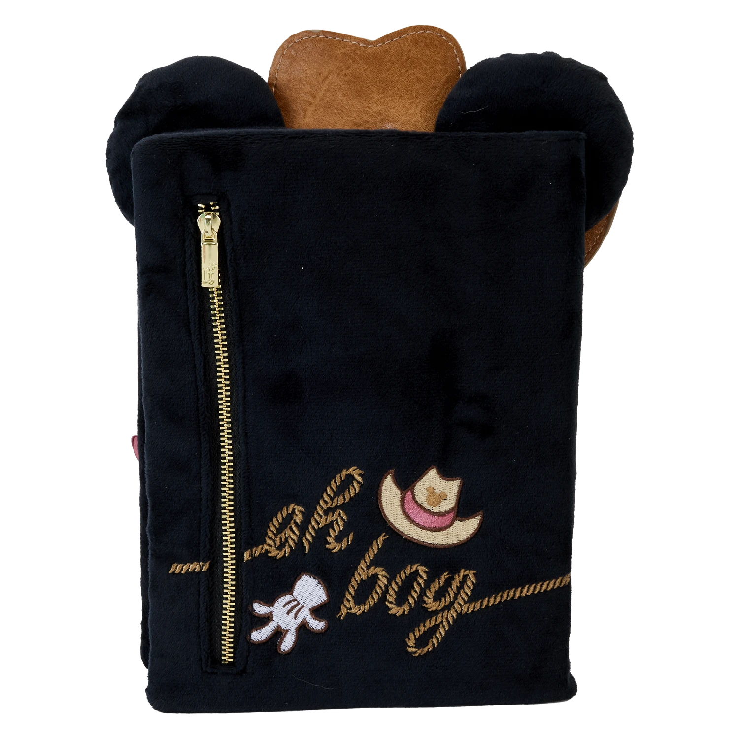 The Loungefly Western Mickey Plush Journal is made with vegan leather (polyurethane) and shiny gold hardware. Additional features include plush, applique, debossed, embroidered, and printed details.