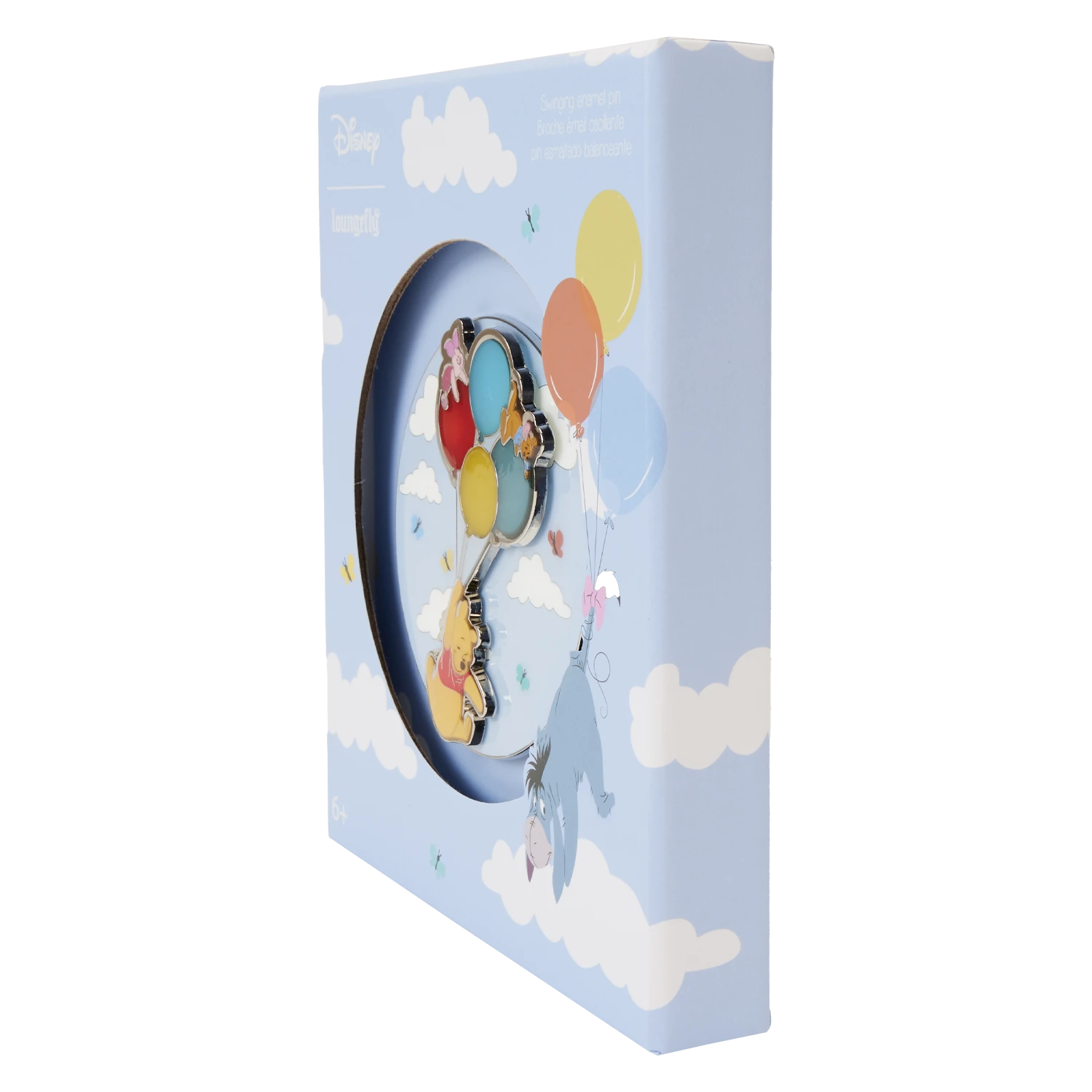 Need a lift? Take your pin collection to new heights with our Loungefly Winnie the Pooh and Friends on Balloons 3-Inch Collector Box Pin. This layered, circle-shaped pin features beautiful prints of a sky-blue background with clouds and colorful butterflies. Winnie the Pooh appears, hanging from the string of a bunch of balloons, while Piglet and Roo ride on top. A mechanism on the back allows you to swing the characters around, full circle. Display your favorite fandom and get carried away with this charming pin.